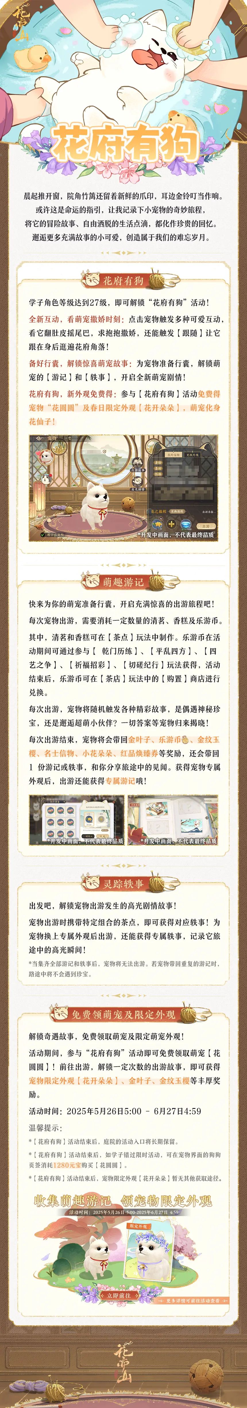 2025年5月26日5:00 - 6月27日4:59,参与“花府有狗”活动即可免费领取萌宠【花圆圆】!前往出游,解锁一定次数的出游故事,即可获得宠物限定外观【花开朵朵】、金叶子、金纹玉樱等丰厚奖励。