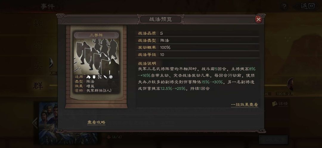 三势阵(阵法战法发动率100%):我军三名武将阵营均不相同时,战斗前五回合,主将提高8-16%自带主动、突击战法发动几率,每回合行动前,使损失兵力较多的副将受到伤害降低15-30%,另一名副将造成伤害提高12-25%,持续一回合。简单来说,就是需要达成三个武将都是属于不同阵营(如魏蜀吴,魏蜀群,魏群吴等),然后可以获得五回合主将自带主动和突击战法8-16%的发动率提升(只有主将自带战法有增加几率)和一个副将减伤,一个副将增伤的效果。但是这些效果只有五回合。