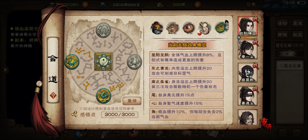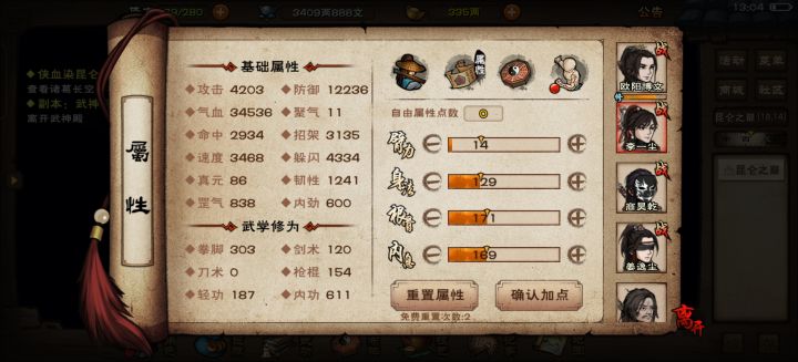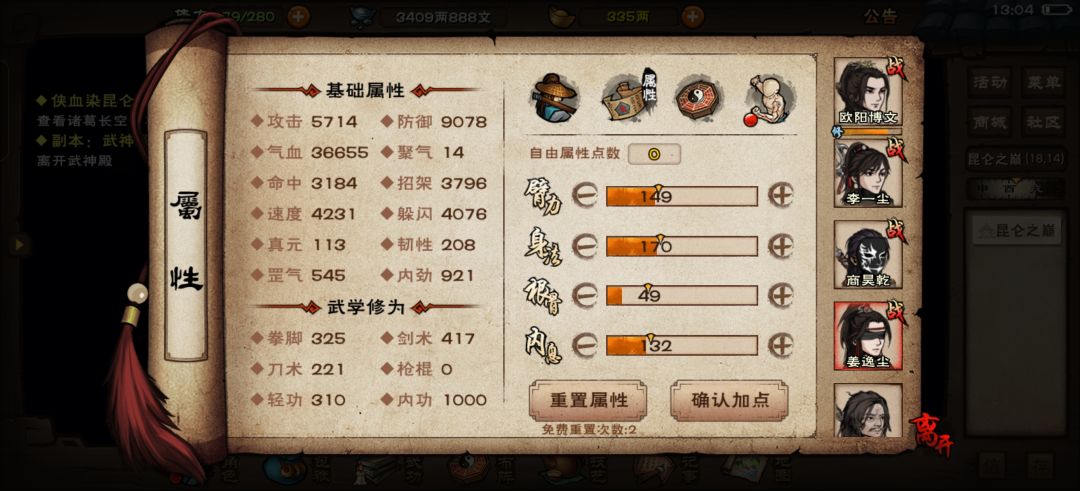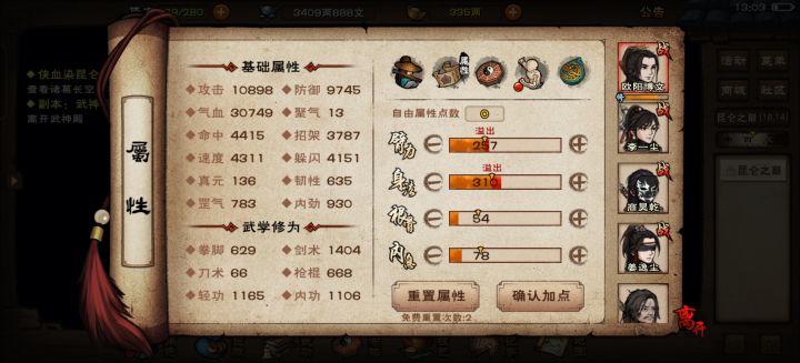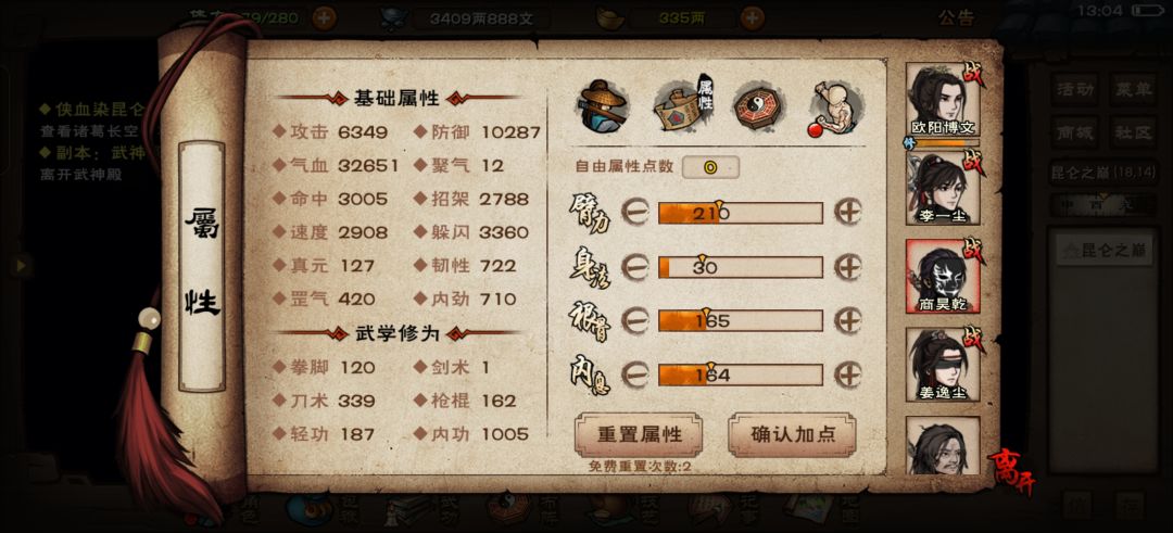 ,应该是我水得太久了,都是33岁的大叔了,也不知道这个面板能不能速刷绝世(这是所有buff拉满了的,除了没上香)。纯纪念帖子,参考价值不高,所有资源都堆给主了,随从能活下去就行,不求打输出,所以打诸葛长空我弹的气血琴,怕扛不住最后一剑,结果不疼,就小姜没抗住。