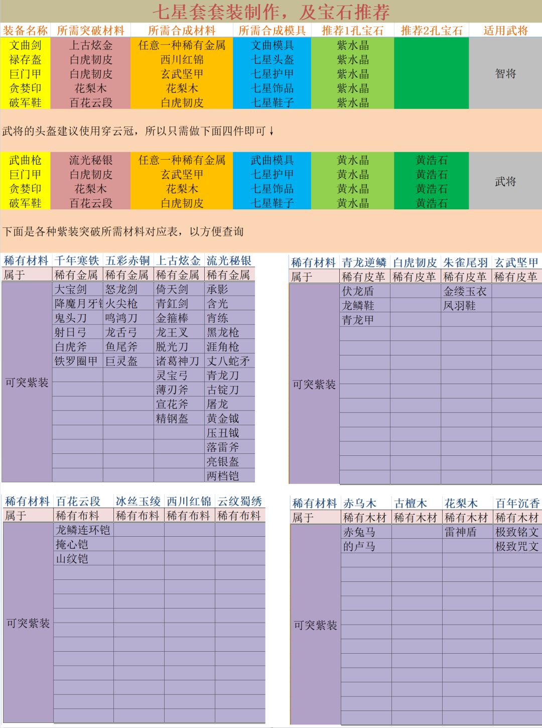 友情提示:平民智力将5件七星7级紫水晶足够了,武将七星四件8级就够用了。七星切勿多做,避免浪费。新手不必为了做装备去买紫色装备,寻将可大量获取紫装。等材料够了都有了