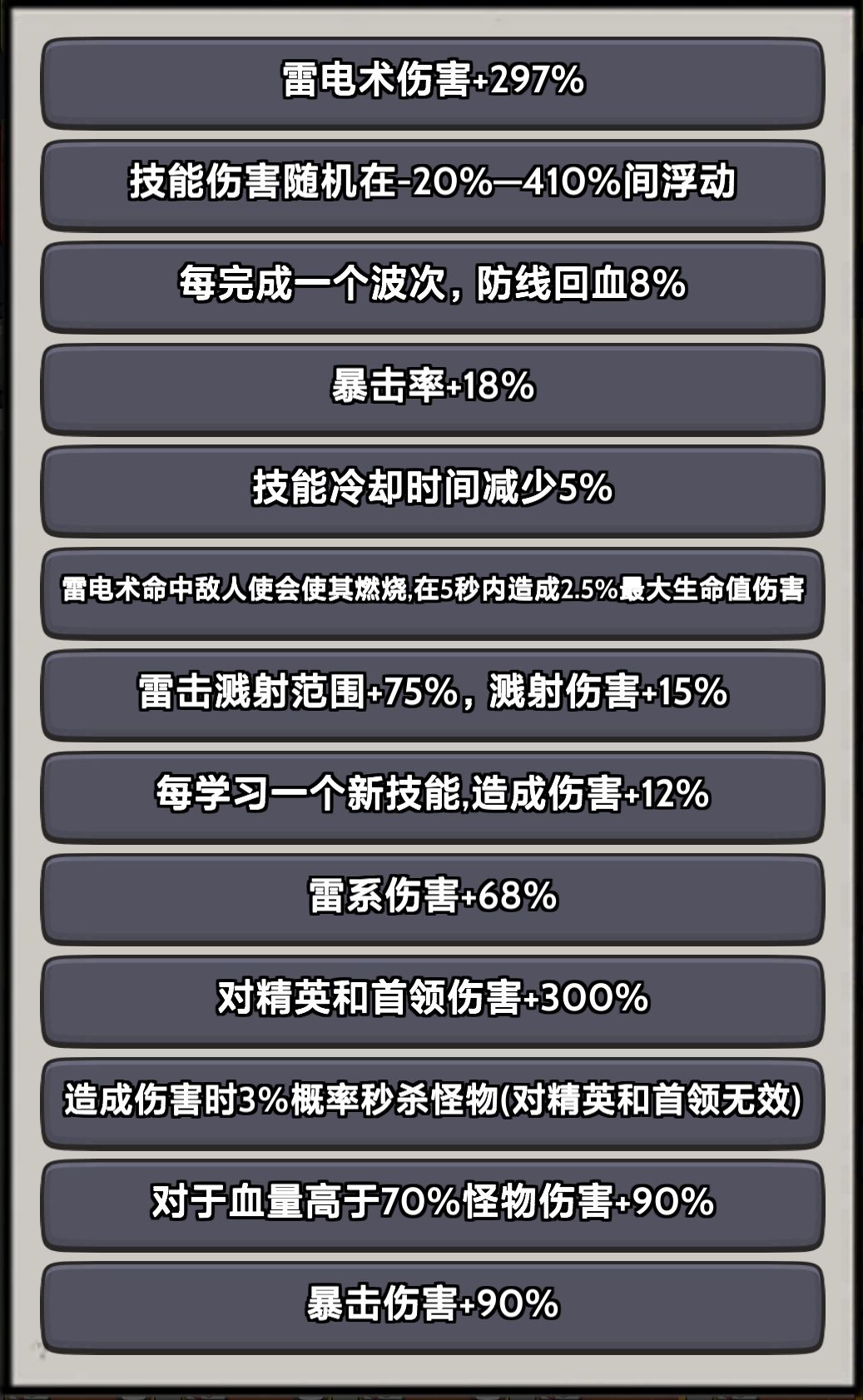 局内属性强化:最重要的来了,优先选择城墙血量上限加10%,最好在250层之前学到50层才有希望过,否则大概率过不了,次要选择雷系增幅和最终伤害,其他的都是垃圾看着选。过了300基本就要做好卡死的准备了