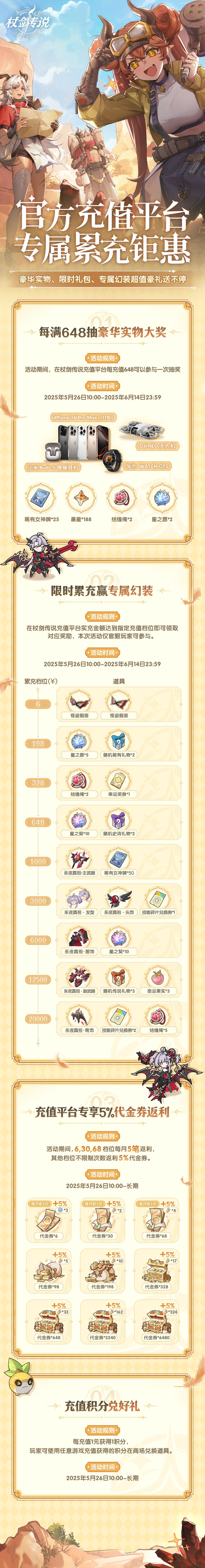 · 充值积分仅能在活动开启后(5月26日10:00),在官方充值平台充值后才能获得。前序测试充值金额不计算充值积分。