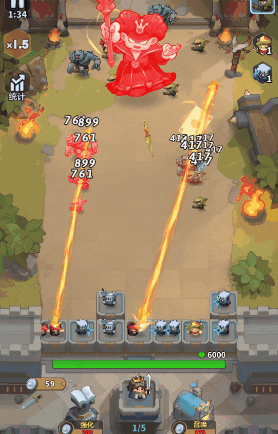 加上红心皇后吸走火力,同时可召唤攻速快的卫兵,往往出现英雄一个劲打皇后,卫兵和哥布林、双头绿皮扑城墙局面。而哥布林炮手乘机在怪物中间远程攻击城墙。