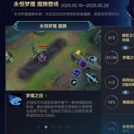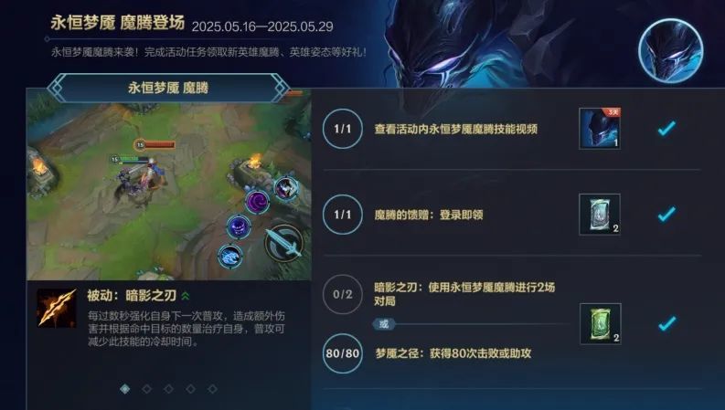 截止至5月29日,召唤师完成活动任务即可领取新英雄永恒梦魇 魔腾、英雄姿态-席卷、传奇图集三星卡包(蓝)等好礼!