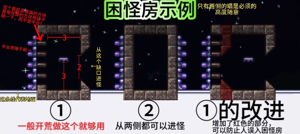 困怪房,顾名思义就是可以困住怪物的房间。使用困怪房可以防止怪物进入房屋,可以保证玩家能攻击到怪物,但怪物攻击不到玩家,并且由于怪物聚集在一个小空间内,也便于刷怪。