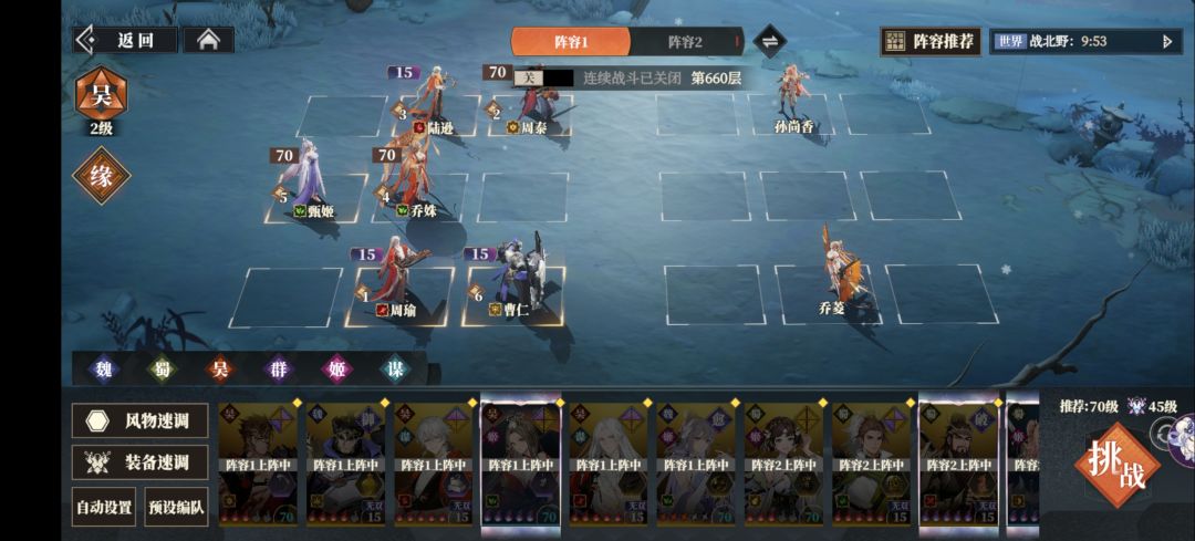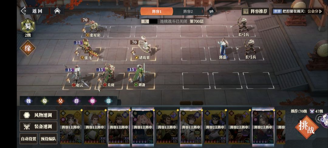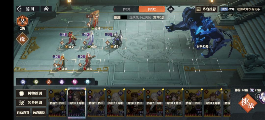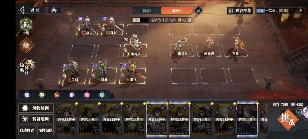 700层最好不能有减员,需要点杀能力强的,张辽打此关最简单,输出不是很够的需要带禁疗。