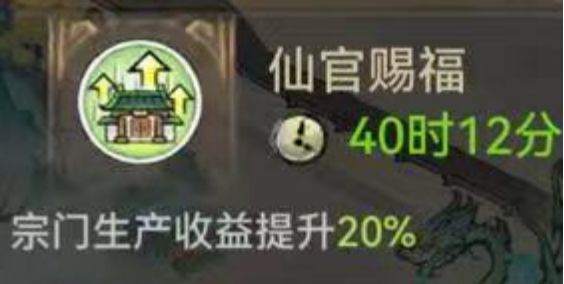 在某个周六,春华秋实活动期间,驱赶走了草灵后,我的宗门繁荣度很高能吃到那两个常规的生产buff,刚好还在问鼎夺魁的buff时期内,我有荣誉股东月卡,手动有趣配备好了世家buff,盟内的福禄仙官没有忘记打开我们摆阵内的仙官赐福,正好手气爆棚的司天大大抽中了40%二级资源加成!