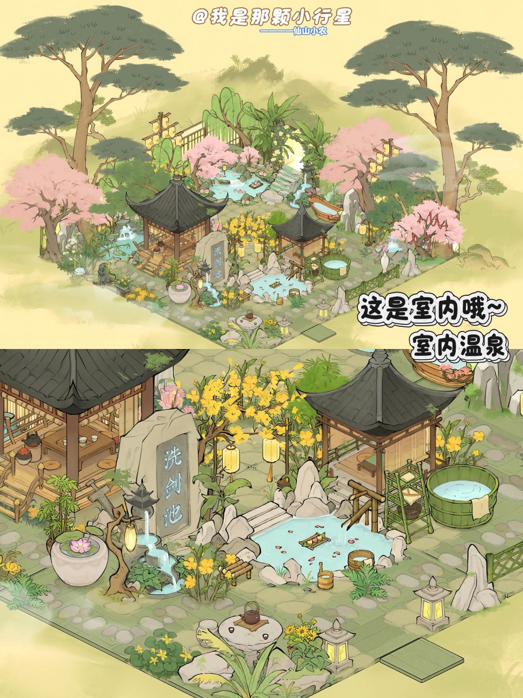 这期我非常非常惊喜,星星一开始跟我说是个温泉会所,我以为就是屏风浴桶衣架之类的室内组合,装完一进家门惊艳到我了,是我没想到的室外搬到室内系列,所以我们戏称这个系列为“进的不是家门而是传送阵”。