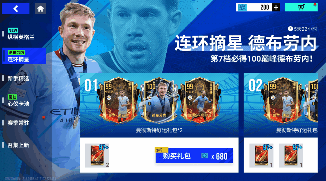 【连环摘星】5月26日11:00-6月2日11:00期间,通过参与活动购买连锁礼包,有机会获取100潜力值闪回巅峰前腰德布劳内!