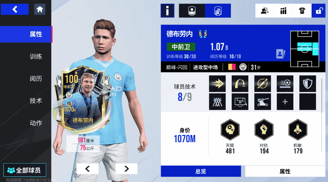这张100潜力闪回巅峰的德布劳内,将传球艺术演绎得淋漓尽致,金色【直塞】技术、金色【挑传】技术和金色【大力传球】技术与【传中】技术集于一身,加上高达107的短传,传中和108的长传,让丁丁的传球宛如巡航导弹,精确制导到球场上任意一处地方!除了无人出其右的传球能力外,丁丁在其他方面的技术也是至臻化境,屡屡利用远射为球队斩获胜利的他,自带【重炮】技术和【贴地斩】技术,在107远射和105脚下力量的加持下,他轰出的世界波仿佛可以洞穿球网!而105的带球,101的抢断搭配【护球】【拦截】技术,让丁丁在带球推进和中场防守方面也有着不容小觑的实力!作为一代中场大师的曼城生涯绝唱,这张闪回巅峰的丁丁,是对他这十年蓝月戎马的最好写照!