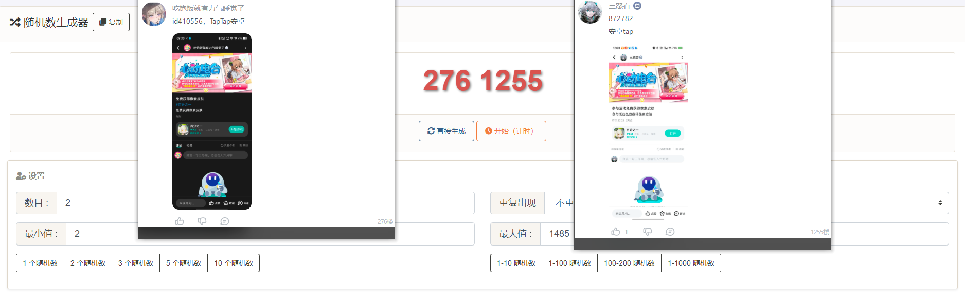 2:奖励以结束时间总楼层数为基准,由在线随机数生成器随机选出;
