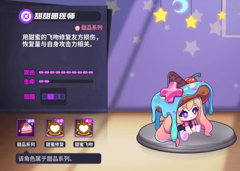 (零星)技能:甜蜜修复:同时为攻击范围内两名受伤的角色恢复生命值