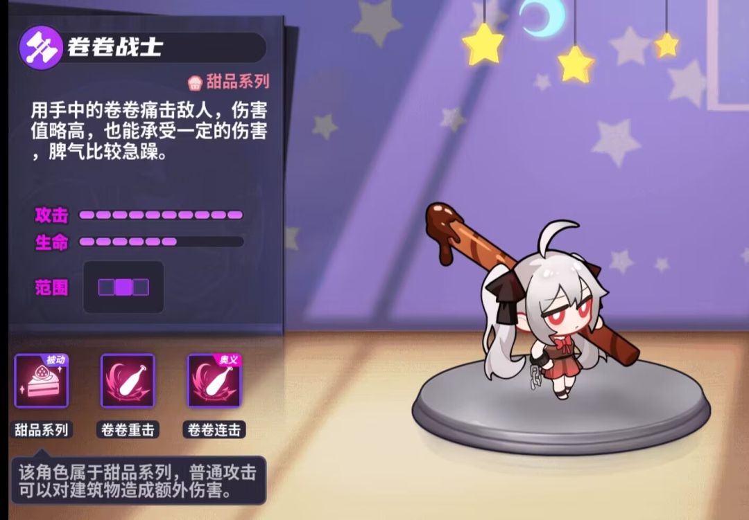 卷卷战士有一定的生存能力,在搭配回血辅助的情况下可以直接当前排,持续驻场。同时因为自身伤害出众,所以主线关卡常常一排卷卷一排辅助就可以等着过关了