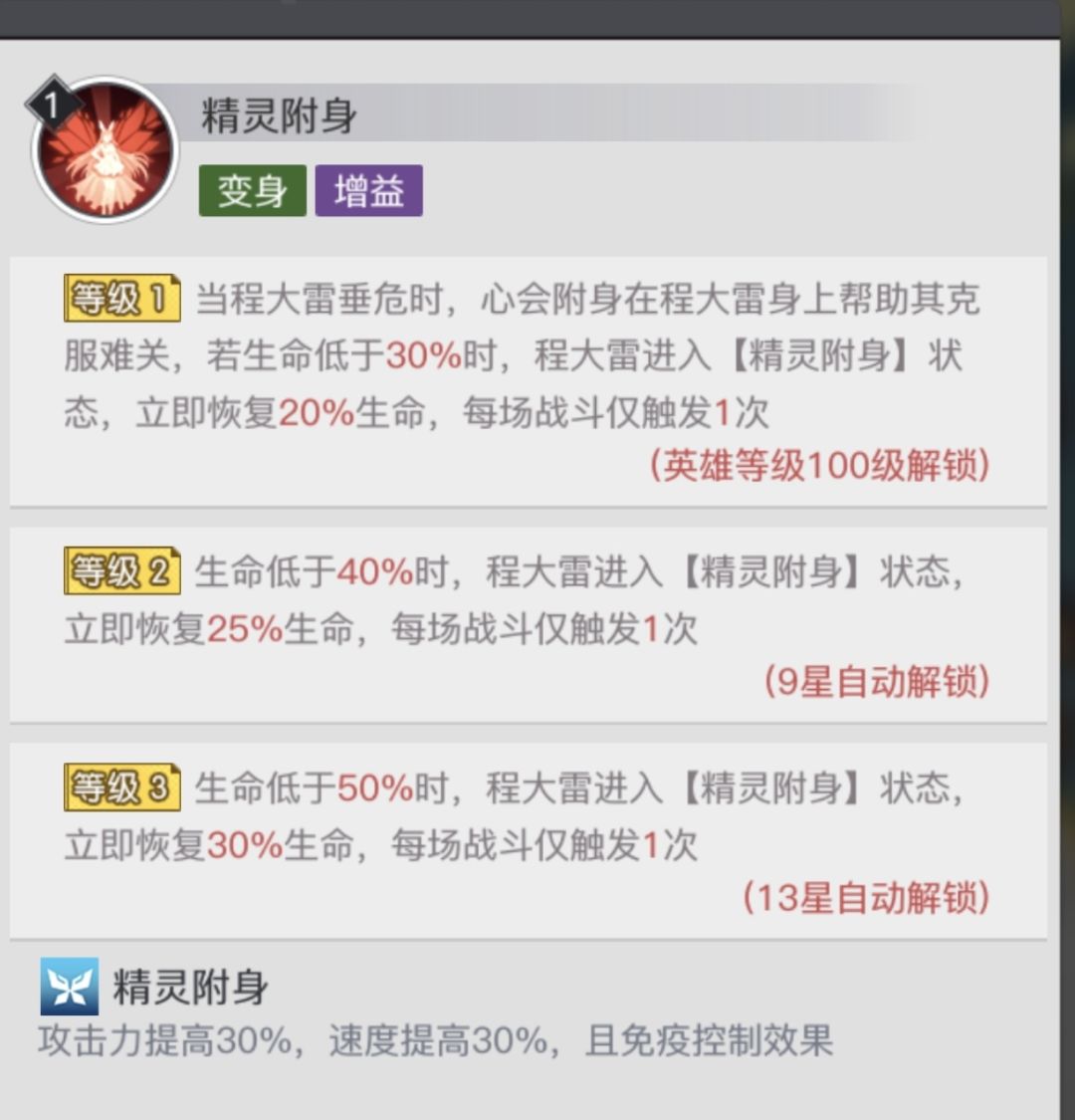 技能满级状态下,当程大雷生命低于50%时,心会附身在程大雷身上帮助其克服难关,使得程大雷进入【精灵附身】状态,立即恢复30%生命,每场战斗仅触发1次。