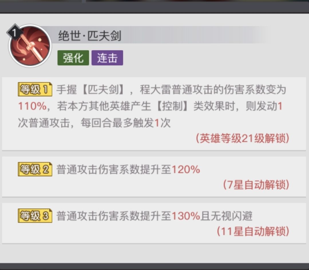 该技能满级时,程大雷普通攻击的伤害系数变为130%,且无视闪避。若本方其他英雄产生【控制】类效果时,则发动1次普通攻击,每回合最多触发1次。