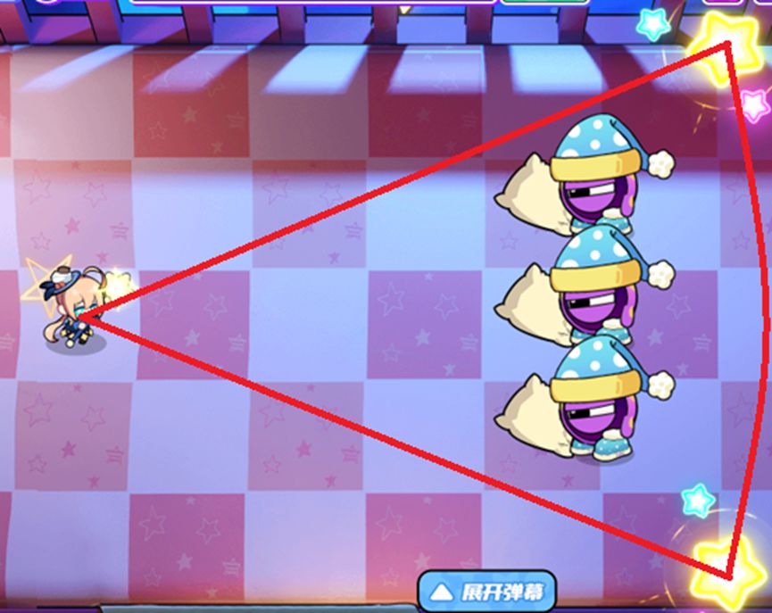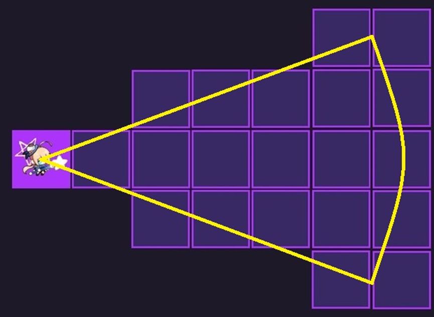 注:图中的射程距离实际为索敌距离,当敌人进入索敌距离时星星法师进行攻击。实际上星星法师的射弹射程要比索敌距离长一格。星级4在原有射程的基础上再加了一格,星级4的射弹射程如图: