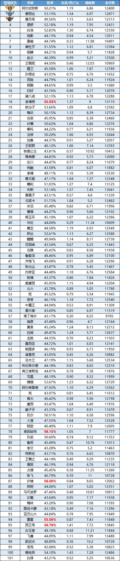 排序:按登场率高低排序,标红为胜率前5