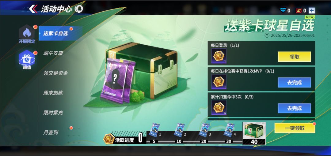 5月26日-6月1日,每日登录游戏找哥们去赛场一起开黑,就能获得活动积分。累计获得40活动积分即可在【活动-超值-送紫卡自选】领取“端午紫卡自选礼盒”,18个紫卡球星任你挑!