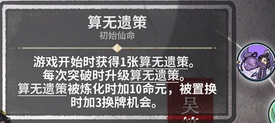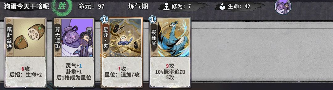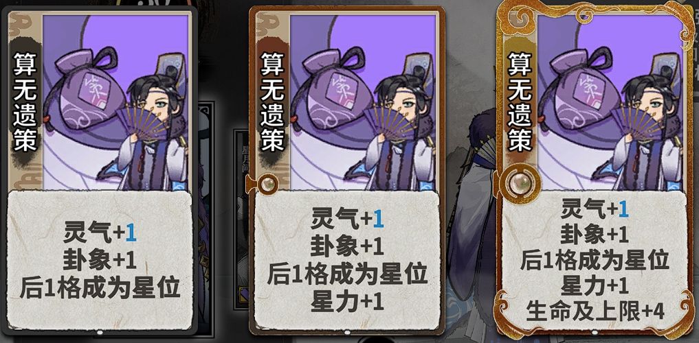 炼气期常把算无遗策摆在二号位,可提供两灵气一卦象,注意卦象尽量让揽雀尾吃而不是野马。如果首轮有两张耗灵牌可考虑摆牌为“耗灵牌-算无遗策-耗灵牌”。