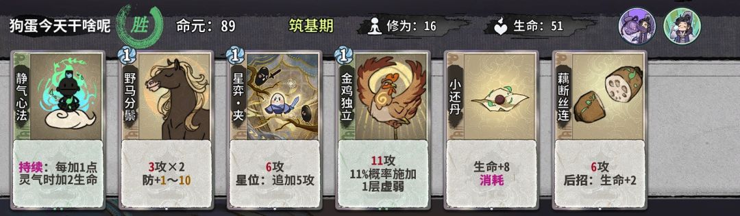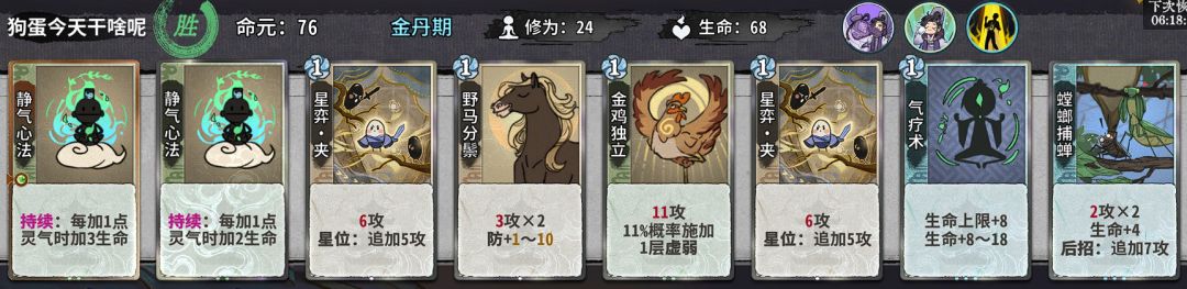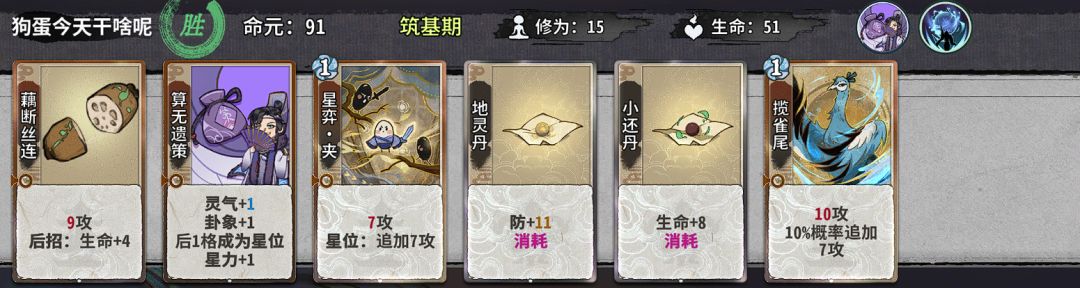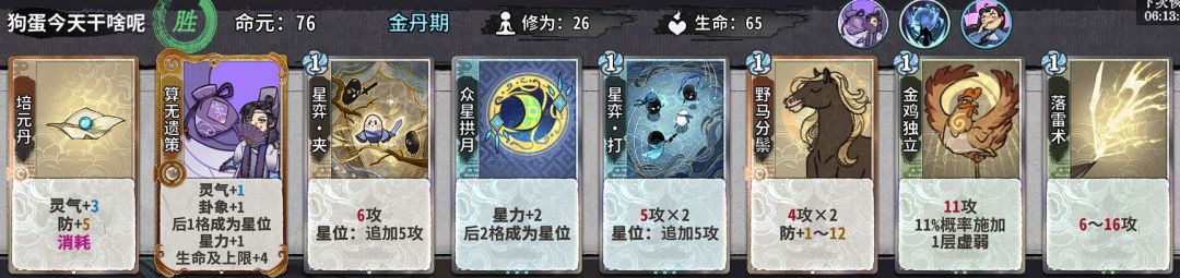 这个仙命价值...忽高忽低的,我个人不作过多评价。但对于斗转吴策来说,我个人建议这个阶段选择加修为的仙命,因为只有在金丹和元婴都选择修为仙命的情况下吴策才能在11轮不空牌上化神;而且这个体系也较为吃先手,星力体系很大一部分的优势来源于可以灵活出虎、断这种对策卡干扰对面,这种情况下,拥有先手意味着拥有更大的博弈空间。
