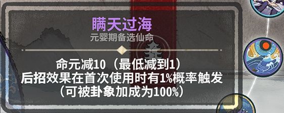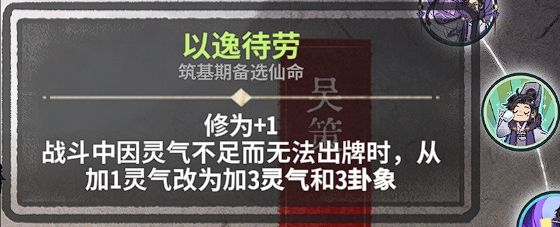 依然是非常利好新手的一个仙命,尤其是还在想不明白灵气和卦象的入门阶段,选择以逸待劳一键解决你的烦恼,几乎可以先跳过对过渡运营的学习先熟悉成型公式。作为一个筑基仙命来说,这个仙命本身的数值就很优秀,相当于一张不会给对面加灵气的二级兑卦,在很久之前的版本里这个仙命并不带修为,当时可能还需要在选择修为和选择高数值过渡之间犹豫,但经历加强之后选择以逸待劳并不会耽误你上本和抢先手,是个非常值得选取的仙命。