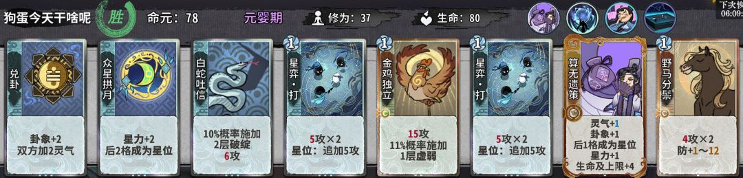 (优选)核心思路是蛇的破绽喂给有高额星力加持的星力牌,打一个先手六动杀。(兑卦二级时七动可放伤害牌,八栋随便补个丹或者什么也不放)