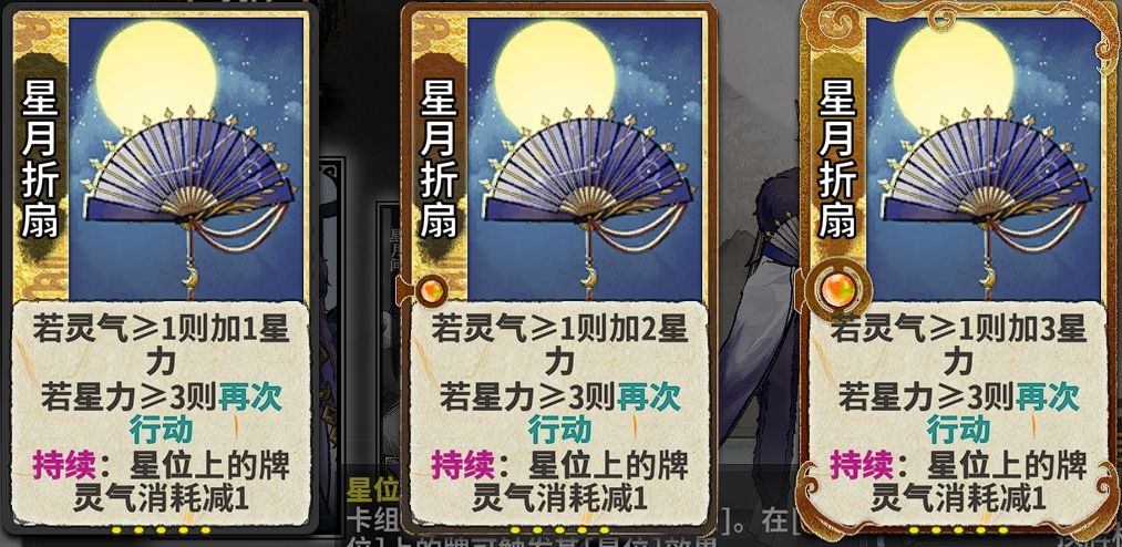 星力吴策的核心,必选。有一个细节是这张卡效果的触发有先后顺序,是先结算“若灵气≥1则加1星力”,然后再结算“若星力≥3则再次行动”,举个例子,一号位一级众星拱月,触发了三号位的星位加灵效果,这时候就是2星力+1灵气,二号位星月折扇会先结算“若灵气≥1则加1星力”,也就是3星力+1灵气,这时候星月折扇是可以触发再动效果的。