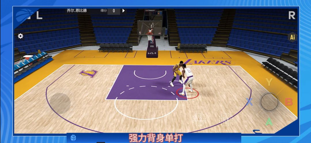 1. 强力背身单打:按住【R】键进入背身,按住加速键【L】+朝着防守者推动【虚拟左摇杆】。这个动作可以让你像推土机一样碾压防守者,尤其是当你用恩比德这样的「技术流」中锋时,能直接把对手顶到篮下。