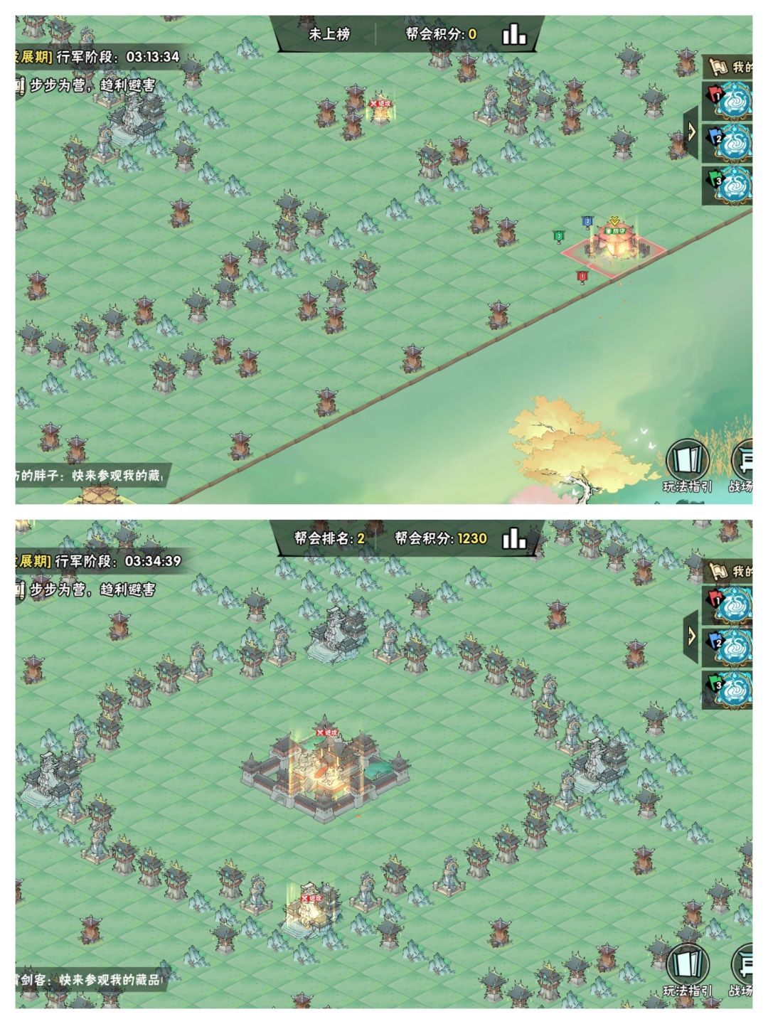 帮会匹配成功,一共8个帮会,随机在地图上,8个阵营(如果大佬阵营离自己近有点不好打,所以随机阵营有点看运气)。一共是40×40,有1600个小格子,每一个格子代表一个地盘,占领地盘,就可以得到该地盘的积分,首次占领获得大量积分,每个格子有不同的建筑,占领积分就不同,点开格子有积分说明,最后输赢,就是比谁帮会占领的格子多,地盘多,获得的积分多。一共有7种类型地盘,积分都不同
