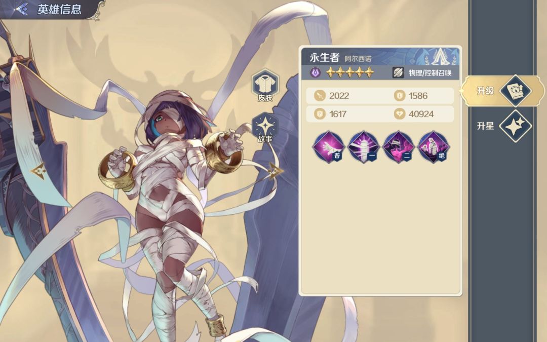 召唤一个不断向周围扩散的黑色领域在其中不断出现木乃伊,木乃伊继承阿尔西诺80%的攻击力和20%的防御及生命值,场上最多存在4个木乃伊。