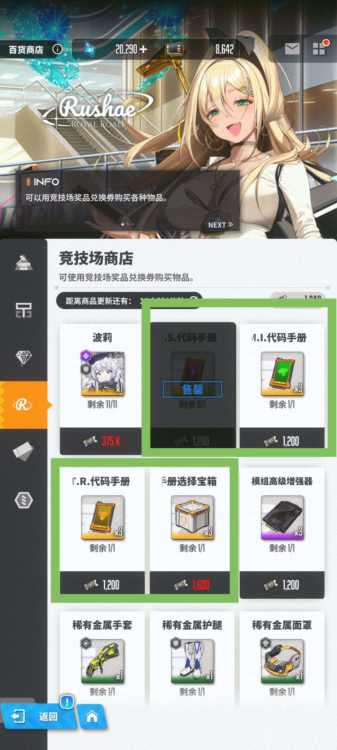 🔴竞技场商店:只买代码手册,在前期不够资源每天清完这四个的时候,优先买对主c需要的,比如我的红莲是电属性就只买电代码。