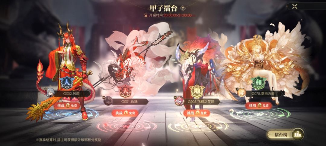 擂台榜会固定显示上赛季结算时的最终四位擂主。于当赛季每日为其发放大量奖励。
