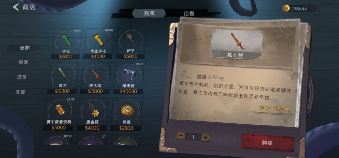 桃木剑:新手真神,刺刀和铲子的结合体,拥有高爆发及高距离,虽然操作难度比铲子高但稍微练几下就能上手,能击杀除木偶外的所有怪物。理论上能杀怪最快一刀一个。所有模式都适合可以说只要不破产那么近战武器它是必选。