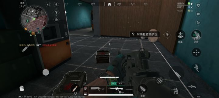 如图所示,我们在这里,打个士兵,然后上去拿枪,朝天上慢悠悠的点射。一定要慢,等雷斯一伙来了就跑下来。