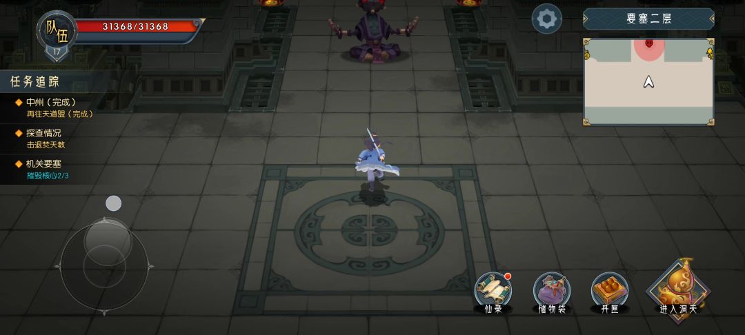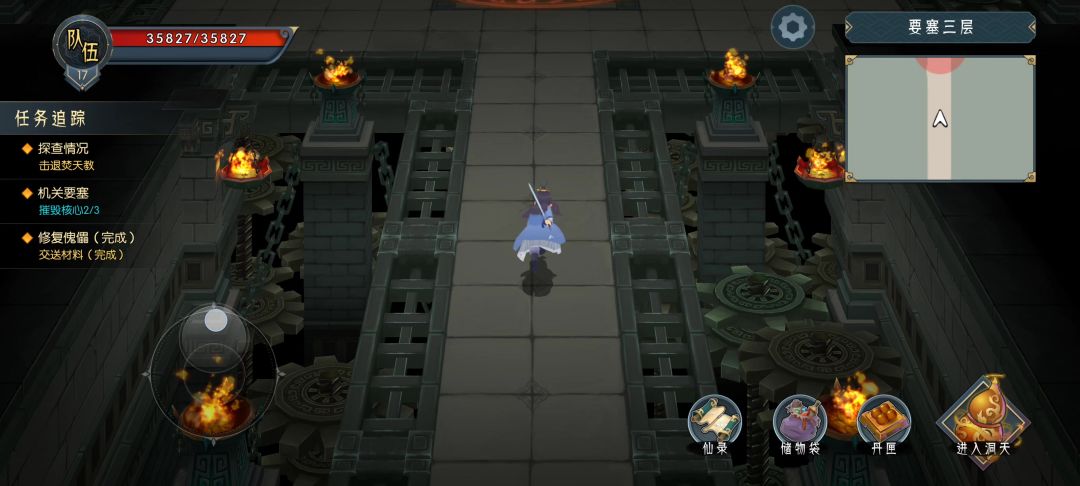 打完之后获得火神器紫薇天火种,继续向上破坏第三个机关,破坏完机关之后我们回到第三层刚进门处,通过传送阵传送回中元峰,触发一段剧情,我们发现要塞出现了问题,需要再进去看看,主线任务三结束,同时解锁新主线任务。