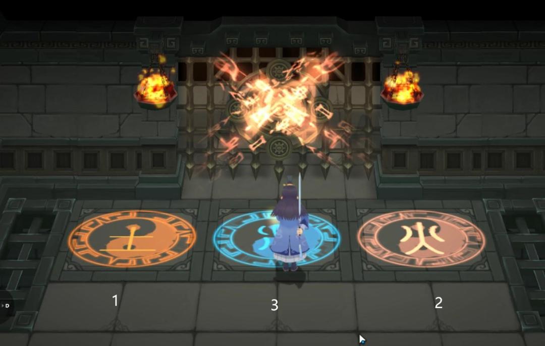 进入第三层,触发剧情,得知我们需要去解机关,走到上方机关处,触发交互,解法如下: