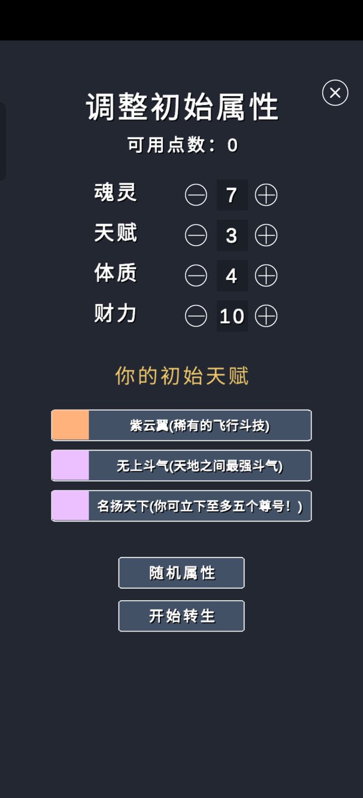 4个人财力选10,可以成皇族家庭,前期事件里势力赚钱好多,到后期你突破时选个家族求助送你个丹药直接突破斗宗(应该是斗宗忘了)