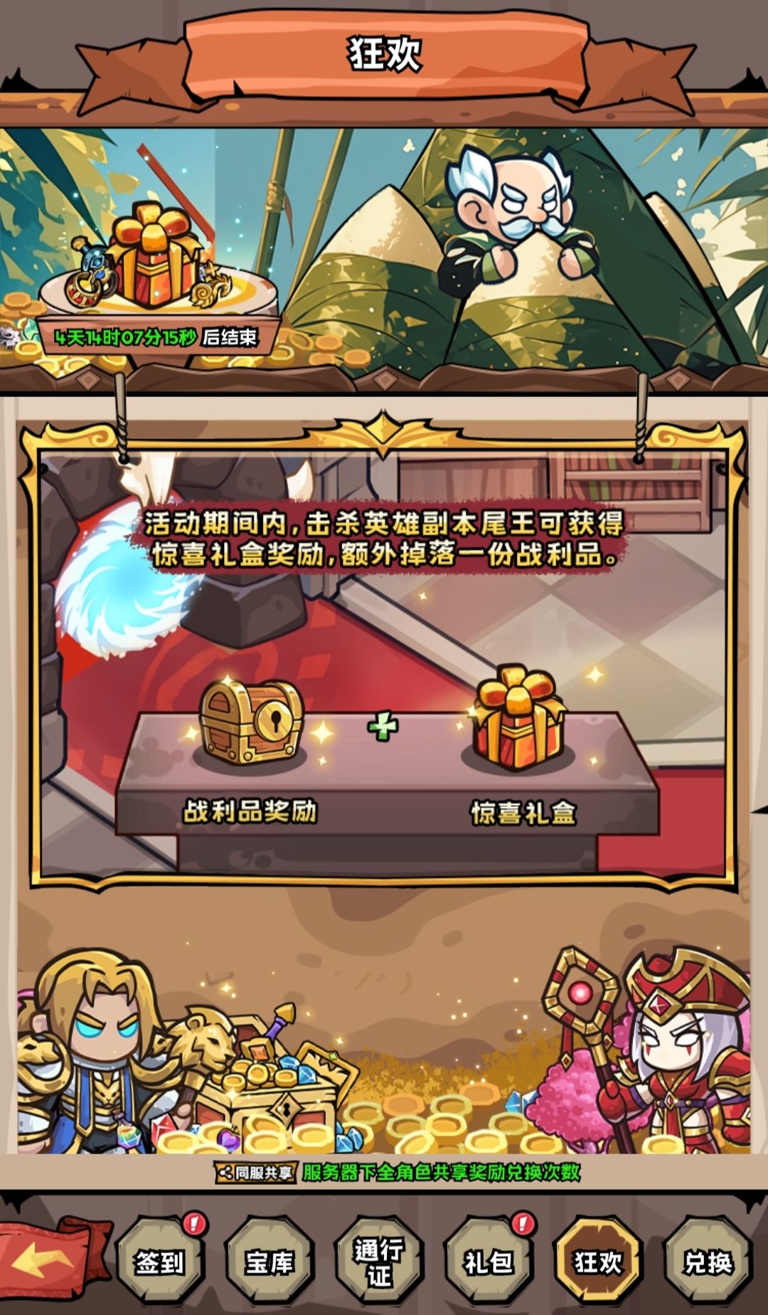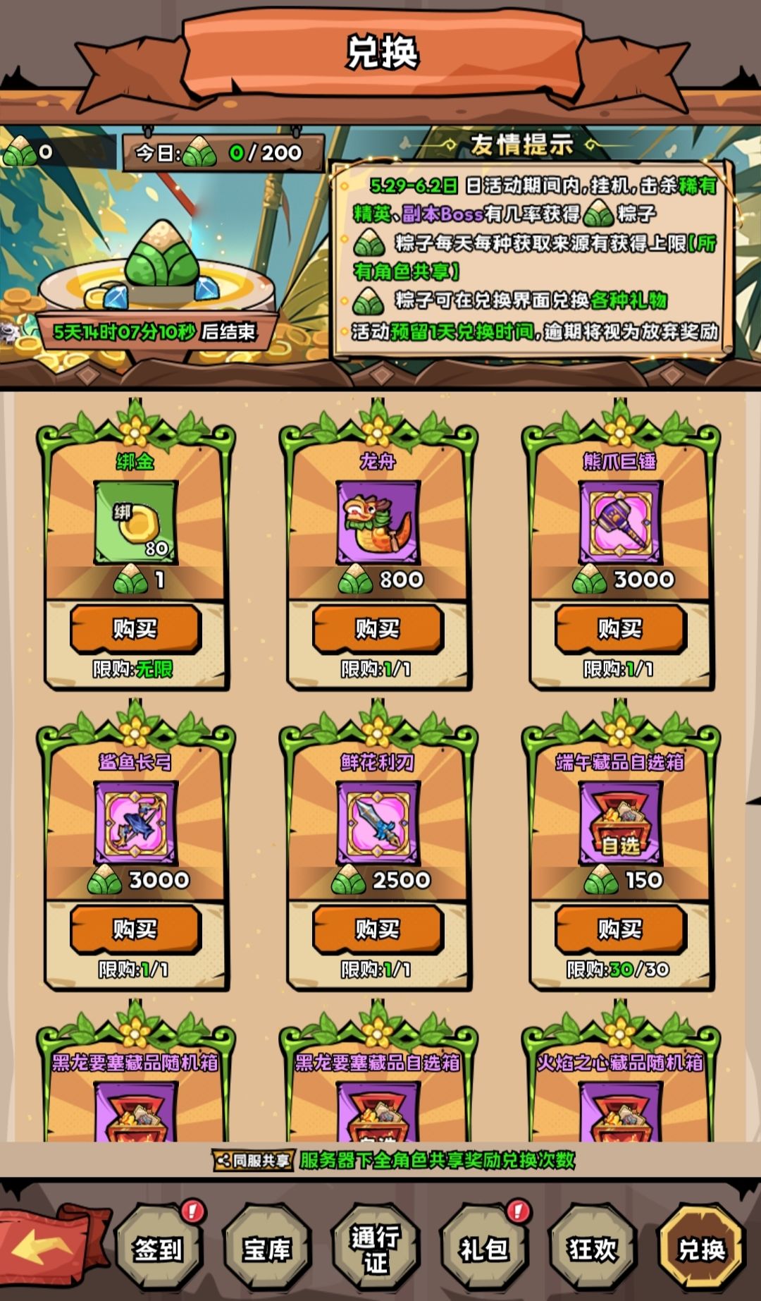 在5月29日-6月2日的端午活动期间,英雄们通过挂机,击杀稀有精英、副本Boss有机会获得粽子道具。凭借粽子可在商店兑换各种礼物,包括端午活动专属称号“粽是有你”,和“熊爪巨锤”、“鲨鱼长弓”、“鲜花利刃”职业武器主题外观,以及藏品自选箱等丰富材料资源~