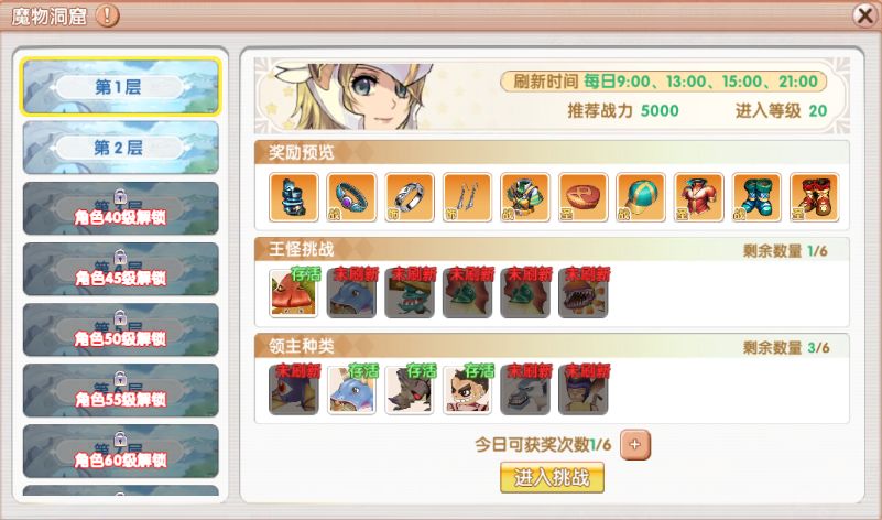 3、每层领主在每日固定时间点刷新,王怪在击杀一段时间后刷新。时间可以看地图倒计时!获得奖励以及注意事项