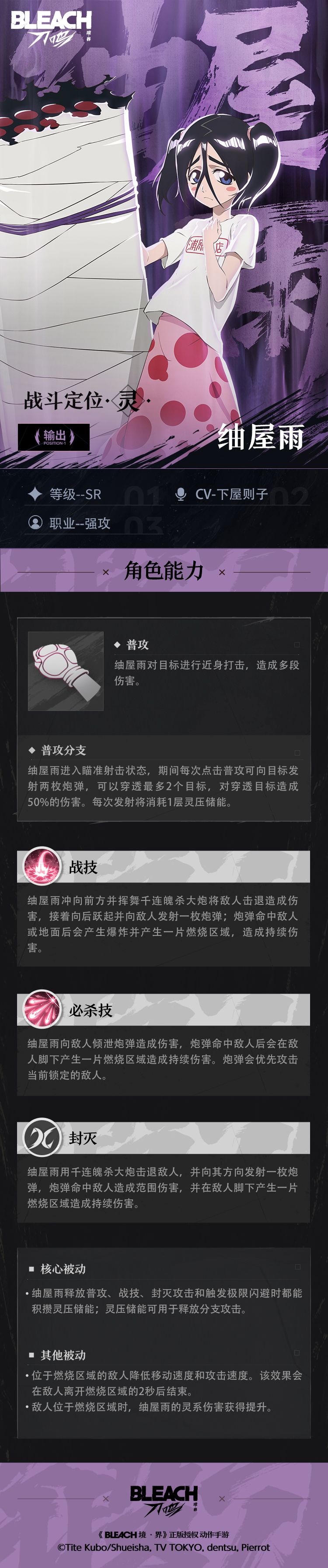 游戏中的她是一名强力的输出型角色,拥有使用灵子大炮持续射击灌伤的进攻模式,可在场景中留下燃烧区域造成持续范围伤害,并提升自身伤害,一起来看看她的技能吧!