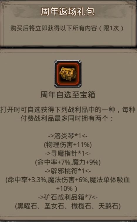 1.对既没有远航之镜与寻魔指针这种类似战利品,也没有猎兽钉和熔岩琴这种纯物伤战利品的玩家而言,周年自选礼包的推荐指数为五星,属于必买范畴(零氪玩家除外)。