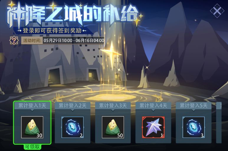 活动内容:受光之女神的庇佑,神降之城物资丰厚。活动期间,每日登录游戏即可领取“粽子”、“神祗碎片”、“王者英魂”等丰厚奖励。