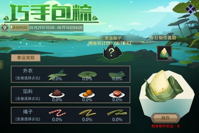 活动内容:活动期间,每日击败精英或首领,可激活1次制作机会。依次选择外衣、馅料、绳子,并点击制作按钮,即可成功制作粽子,并获得今日制作奖励。每日24:00时,系统会自动揭晓“幸运粽子”,若你制作的粽子与幸运粽子有相同之处,还可根据相同部分的数量获得额外奖励。