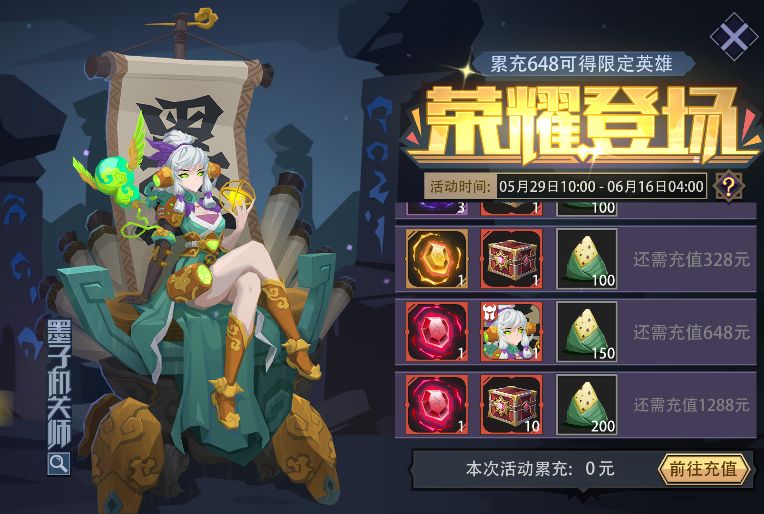 活动内容:活动期间,通过任意方式充值任意金额,都会计算到累计充值金额中,累计充值金额到达对应档位即可领取奖励。奖励包含“粽子”、“限定英雄”——[墨子机关师]、[限定货币抉择箱]、[上古英魂]等豪礼。