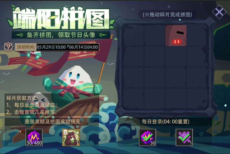 活动内容:活动期间,每日登录游戏可领取魔晶及随机拼图碎片奖励。另外,在(冒险模式/冒险试炼场/梦魇模式)下击败首领也有几率掉落拼图碎片。集齐所有拼图碎片并拼凑完整,即可以获得限定头像——“糯米熊仔”。