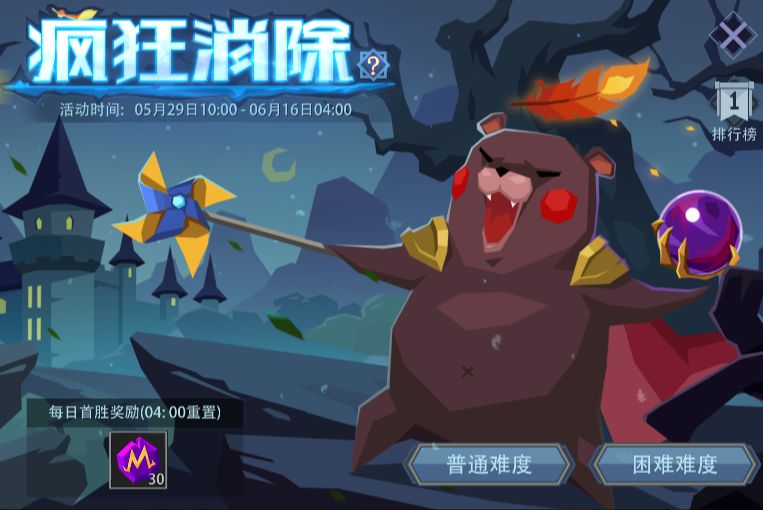 活动内容:需要将三个相同图案的方块点击到左侧的槽位中,使其消除;每成功消除1次,积分+10。游戏中共有7个槽位,请合理进行使用。当“槽位已满”或“全部消除”时,都会出现上浮提示,并视为游戏结束。游戏分为普通、困难两种难度,无论哪种难度下进行游戏,只要每日首次挑战成功即可获得奖励;次日凌晨04:00刷新。挑战成功才有机会进入排行榜,按照难度和分数进行排名。