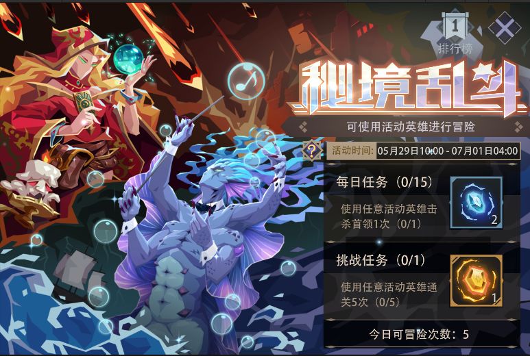 4、活动「秘境乱斗」限时开启,可选用特殊英雄“海族演奏家、灾祸秘法师”进行“冒险模式”;