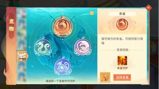 宠物守护系统,需要角色等级达到80级后开放,界面位于宠物主界面,修士们可以为宠物选择【青龙】【白虎】【玄武】【朱雀】其一作为宠物的守护兽。