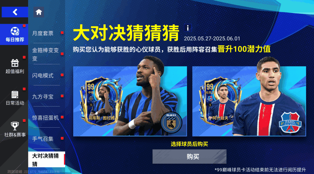 【大对决猜猜猜】活动现已上线!5月28日11:00:00-5月31日23:59:59为活动购买期,购买您认为决赛中能够获胜的99潜力心仪球员。若您购买的球员所属球队获胜,则可在活动兑换期6月3日18:00:00-6月17日18:00:00,通过对应的阵容召集活动,将该名获胜方的99潜力球员通过阵容召集的形式,直接兑换晋升成为100潜力值球员。升级材料只需要同名99潜力球员即可,不需要其他材料。