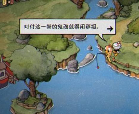 穿过击败利比和呱呱后新出现的桥,来到河对岸后向下走来到陵墓1前,与正在钓鱼的金鱼交谈得知对付鬼魂需要使用格挡拍击。